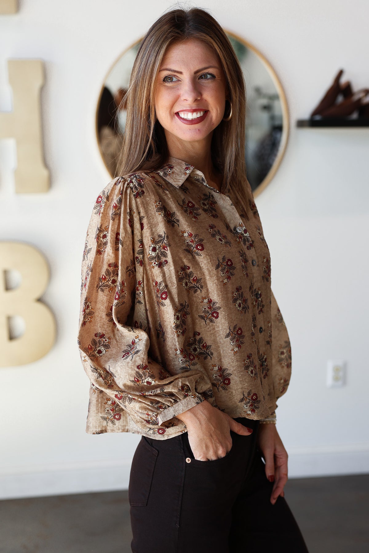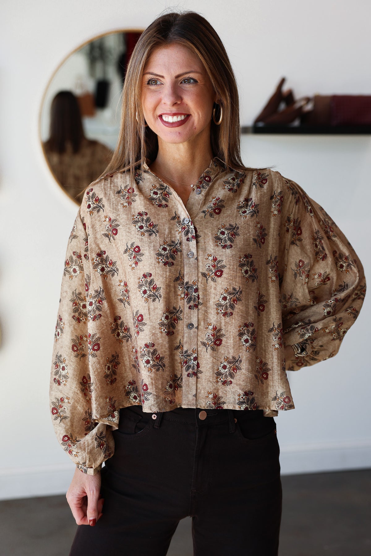 Floral Print Button Down Top - Taupe