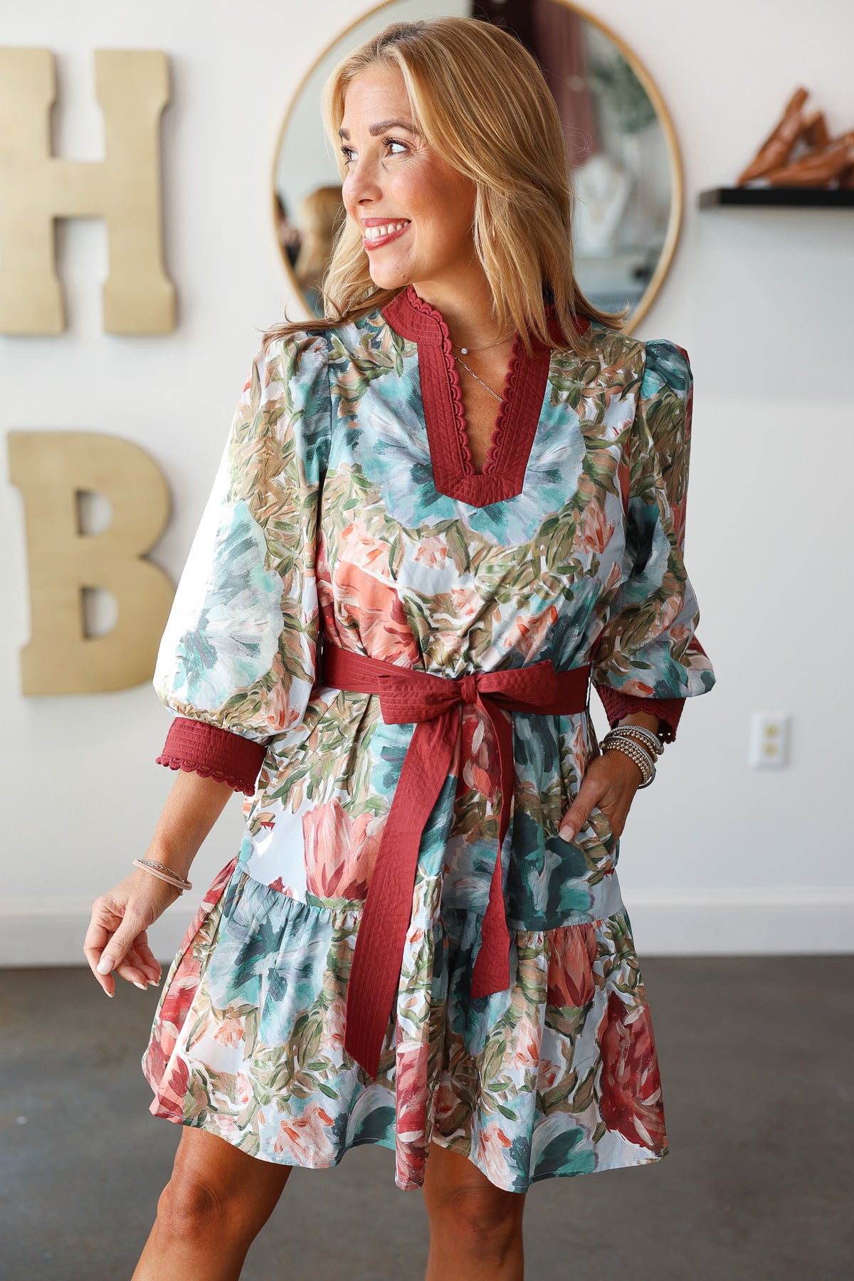 Step into bohemian chic with our stunning Floral Tiered Mini Dress, designed for women who love vibrant style and comfortable elegance. This captivating dress features a beautiful floral print in a harmonious blend of teal, rust, and soft blue tones. Its playful silhouette and intricate details make it a standout piece in any wardrobe. This mini dress is crafted with a flattering V-neckline adorned with a delicate rust-colored scalloped trim, which extends gracefully to a subtle mandarin collar. The 3/4 puff sleeves, cinched with matching scalloped cuffs, add a touch of romantic volume, while the adjustable self-tie fabric belt accentuates the waist, creating a beautifully defined and customizable fit. The tiered skirt flows effortlessly, ensuring a comfortable and airy feel.