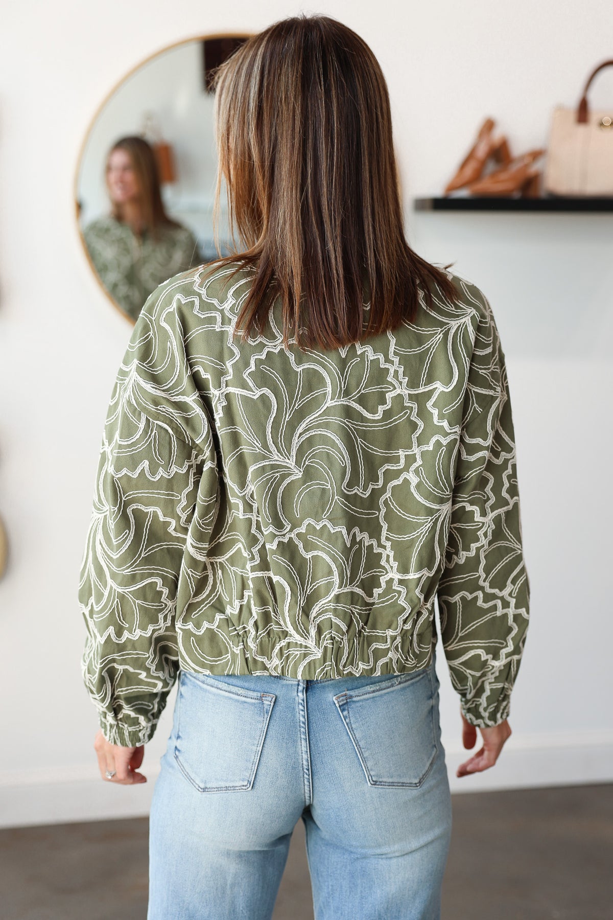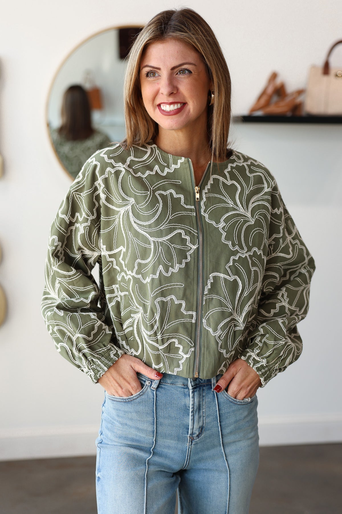 Elevate your everyday style with our exquisite Olive Green Floral Embroidered Bomber Jacket. This statement piece effortlessly blends casual comfort with sophisticated design, making it a must-have addition to your wardrobe. Crafted from a high-quality fabric, its rich olive hue provides the perfect canvas for the intricate white floral embroidery that adorns the entire jacket, creating a captivating visual texture.
