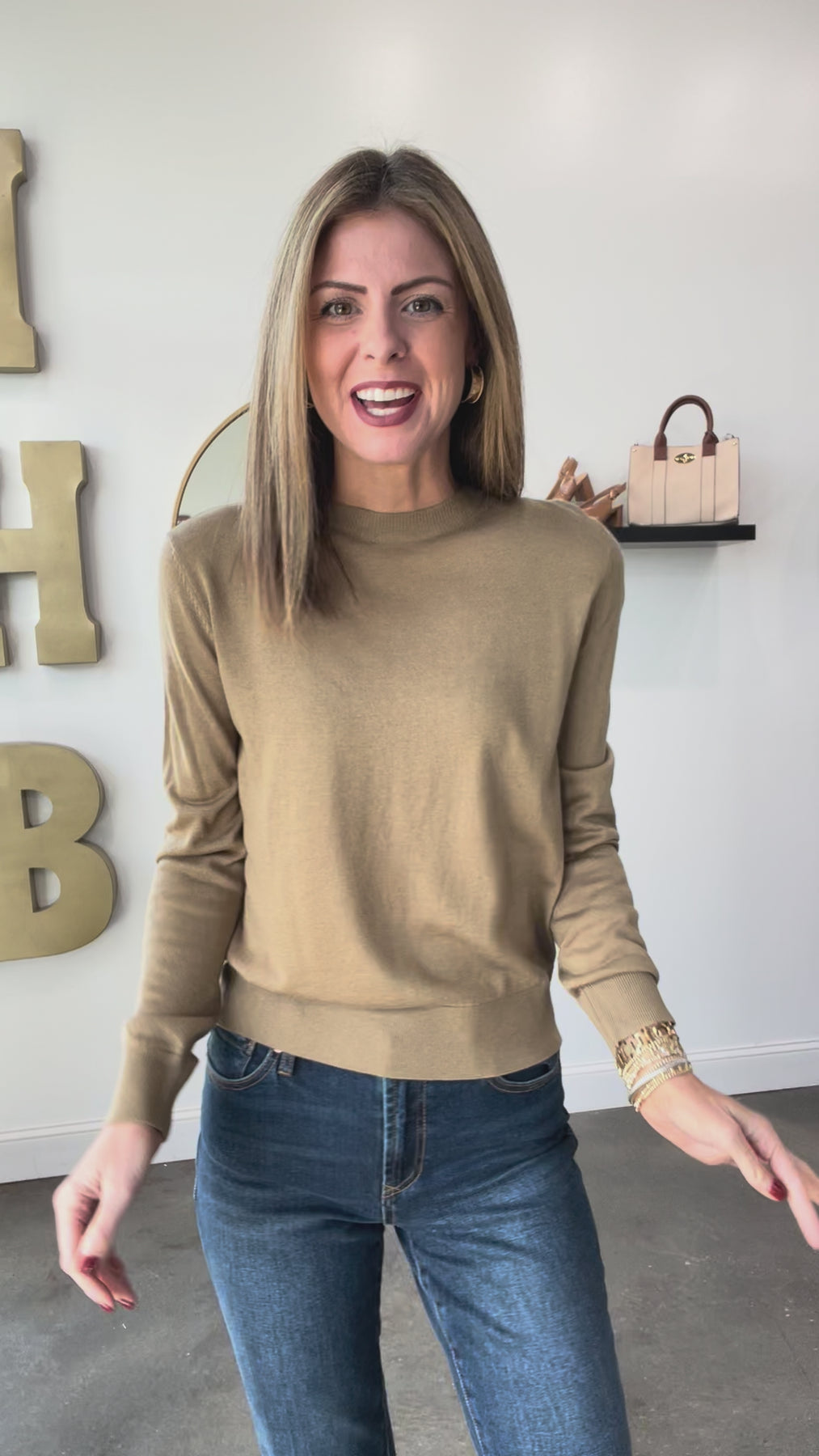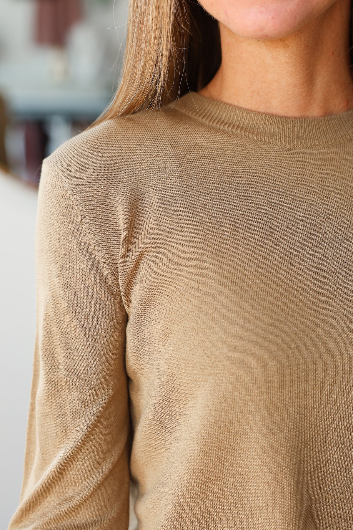Crafted from a supremely soft and breathable fabric, this tan-colored sweater offers the perfect blend of comfort and style. Its delicate fine knit construction provides a sophisticated drape, making it an ideal choice for any season and countless occasions. You'll love its subtle sheen and smooth texture against your skin.