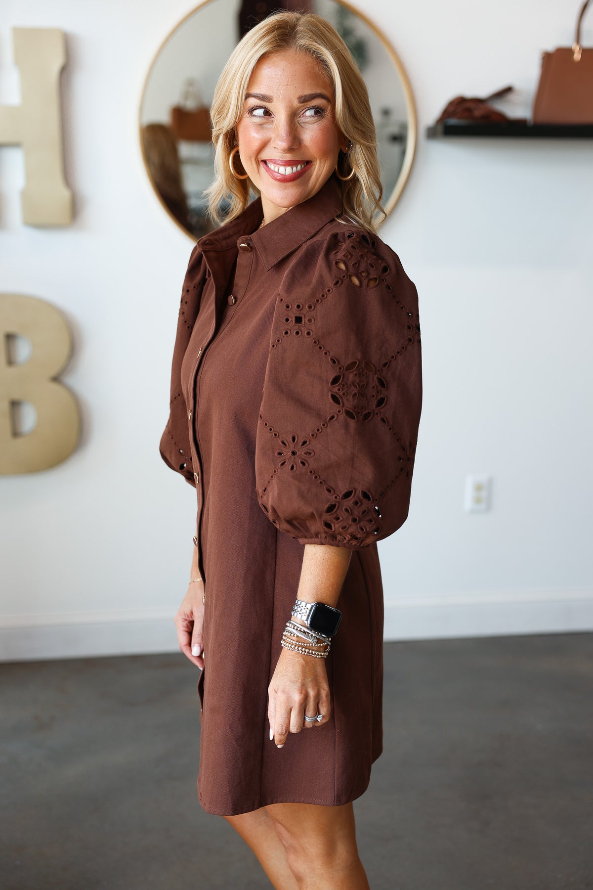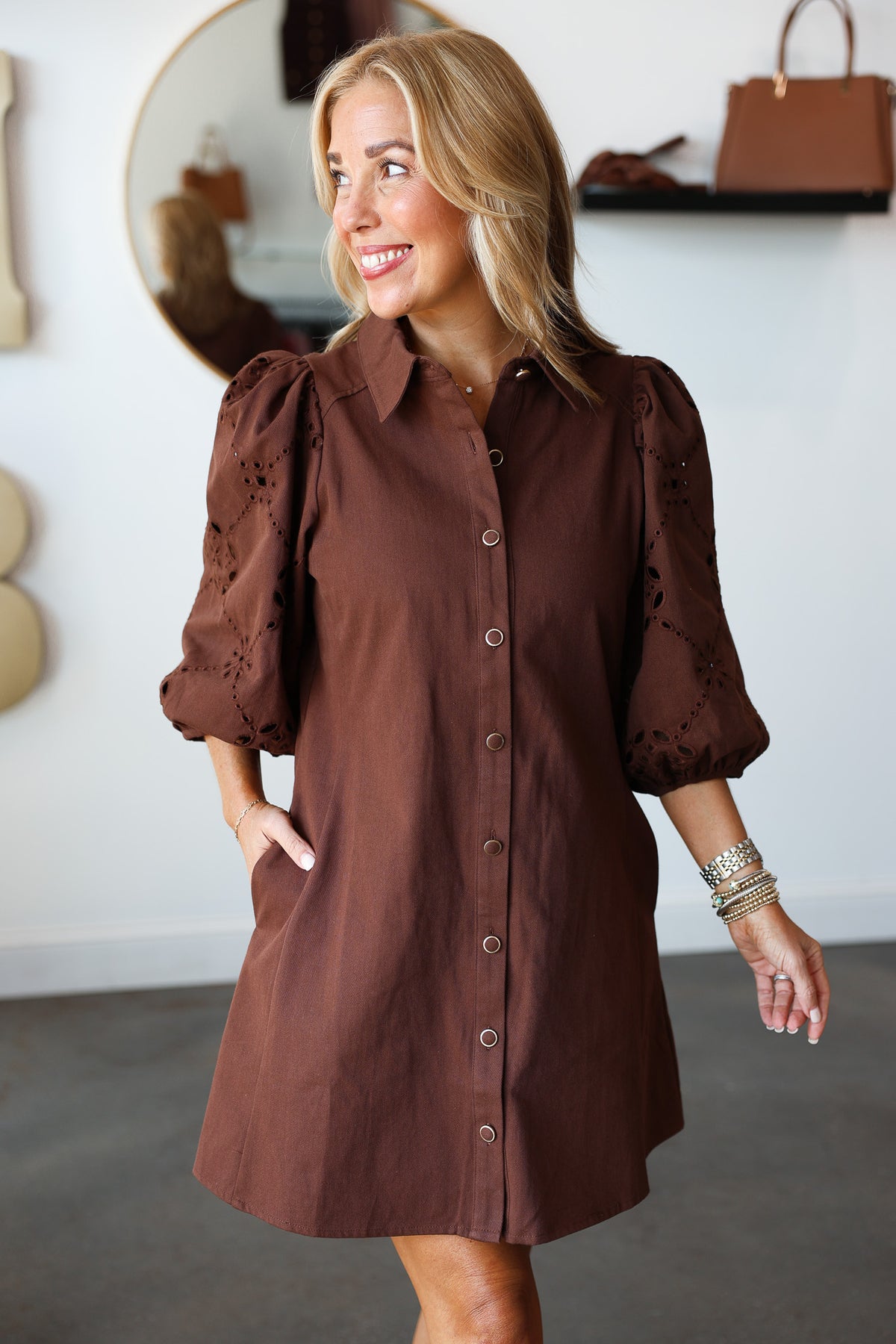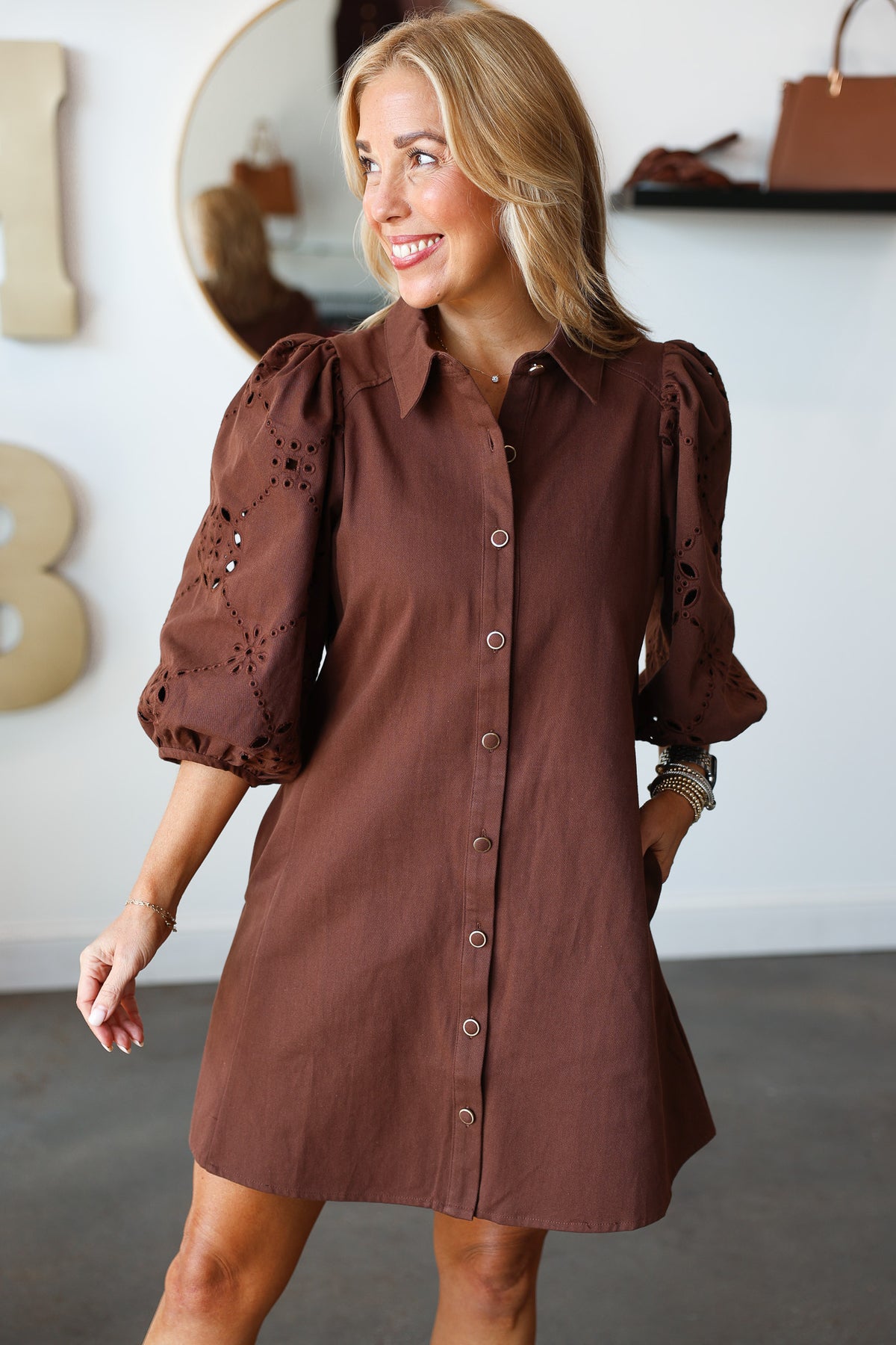 Eyelet Sleeve Button Front Dress - Brown